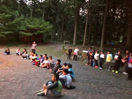 空がだんだんと夕焼けに染まるころ、火の神の登場でキャンプファイアが始まりました。みんな、炎に見とれていました。