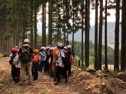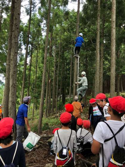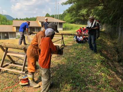 2日目の午後は宿舎の裏の山で、林業体験をしました。最初に森林組合の方の方から、枝打ちを教わって、上の方の枝を切る体験をしました。最後に登った人はずいぶん高い枝打ちで、がんばってきりました。次に間伐をするところを見せていただいて、その木をみんなで運ぶ体験もしました。木の重さも実感しました。最後にその木をチェーンソーで切る体験をして、切った木はおみやげに持って帰ります。いいおみやげになりそうです。