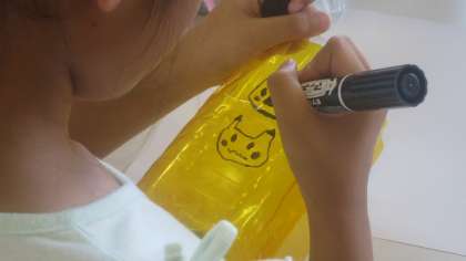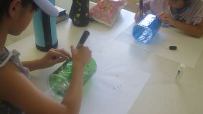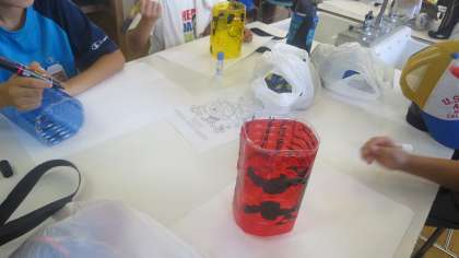 ペットボトルを利用したキャンドルづくりに挑戦です。色のついたセロハンを張り付けて絵を描くシンプルなものですが、子どもたちは楽しそうに取り組んでいました。キャンプファイヤーのときに並べます。楽しみですね。