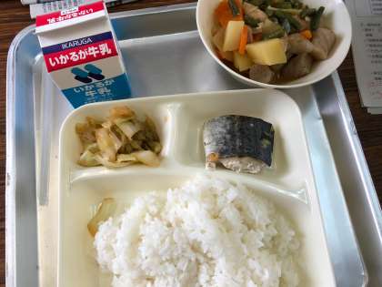 今日から9月の献立になります。今日の献立は、サゴシの塩焼き、じゃがいもと一口がんもの煮物、キャベツのおひたしです。サゴシの塩焼きは焼き物機でふっくらと焼かれていて、塩味もあっさりと食べやすいです。じゃがいもと一口がんもの煮物は、一口がんもに味がしみていて、野菜たっぷりの煮物です。キャベツののおひたしもご飯によく会う献立でした。
