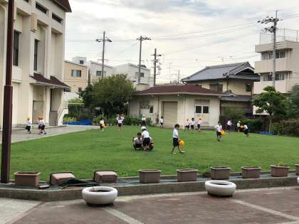 20分休みには1年生が芝生広場で遊んでいました。バッタをとるのに夢中になっている子もいます。