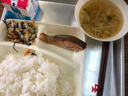 今日9月10日の献立は、鮭の醤油風味焼き、五目汁、高野豆腐の炒り煮でした。鮭は香ばしく焼かれていて、皮までおいしかったです。五目汁は昆布と鰹節で丁寧にとられた出汁の香りが高く、たけのこなどは小さく切られていて、歯ざわり良く、おいしかったです。高野豆腐の炒り煮はヒジキやひき肉と高野豆腐の甘辛さで、食べやすい味わいでした。