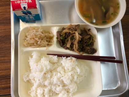 今日の給食の献立は、プルコギ、トック、もやしの甘酢和えでした。プルコギにはしっかりと味がついていて、ご飯にぴったりでした。もやしは柔らかく、さっぱりしていて、これもプルコギにぴったりでした。トックスープは具沢山で、優しい味わいでした。