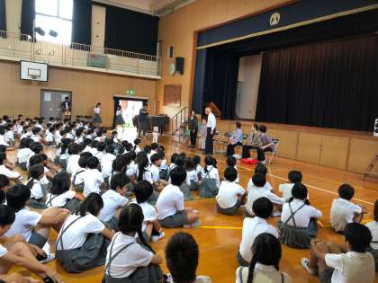 9日13日の朝の児童集会では、老人クラブの代表の方に来ていただいて、敬老大会で配っていただく子どもたちの手づくりのプレゼントを渡す会を行いました。老人クラブの方々からはいつも雑巾をいただいています。今朝もたくさん持ってきていただきました。子どもたちからプレゼントをお渡しして、代表児童があいさつをしました。いつも見守っていただきありがとうございます。