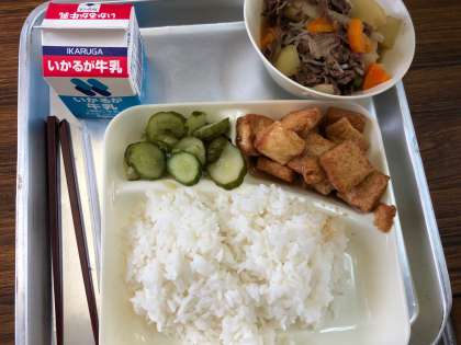 今日の給食の献立は、肉じゃが、厚揚げの味噌だれかけ、あっさりきゅうりでした。献立表には、なすの味噌だれかけになっていましたが、台風の影響で変更になったそうです。肉じゃがの肉はしっかり味がしみていて、厚揚げの味噌だれかけもこってりした味付けがご飯によくあっていました。あっさりきゅうりがアクセントになっていました。