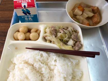 今日の給食の献立は、鶏肉と里芋の煮物、豚肉とキャベツの炒め物、みたらし団子でした。里芋が柔らかく、味がよく沁みていて、鶏肉とよく合っていました。豚肉とキャベツの炒め物はあっさりした味付けでご飯にぴったりの副菜でした。みたらし団子は甘くて少し醤油が効いていて、デザートとして楽しみながら味わうことができました。