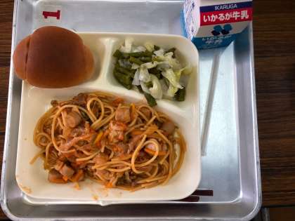 今日の給食の献立は、イタリアンスパゲティ、グリーンアスパラガスとキャベツのサラダです。さっぱりとした口当たりのサラダとウインナーの入ったケチャップ味のスパゲティがよく合っていました。