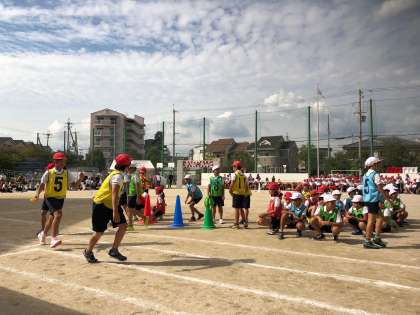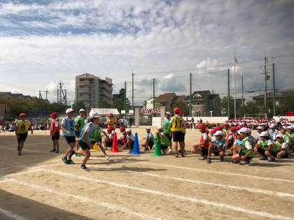 5年生の全員リレー、力一杯走っています。得点板は点数が伏せられていて、どちらが勝つかわかりません。結果が楽しみです。