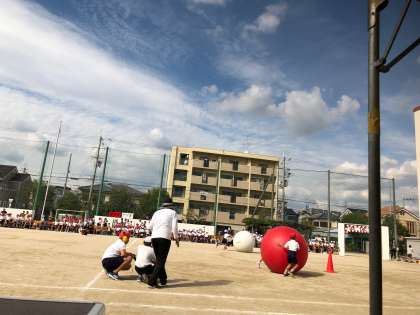 2年生の大玉ころりんは子どもたちより大きな玉を転がすので、なかなかコーナーを回り切れず、別の方向に行ってしまうこともあり、笑いを誘っていました。子どもたちは真剣そのものなのですが。