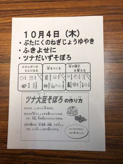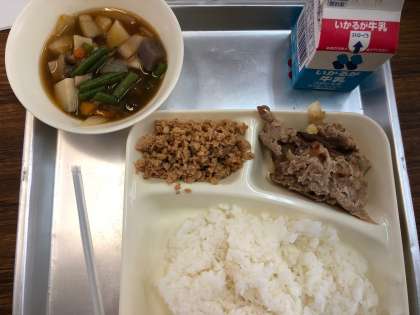 今日の給食の献立は、豚肉のねぎ醤油焼き、吹き寄せ煮、ツナ大豆そぼろでした。豚肉のねぎ醤油焼きは、こってりした豚肉とねぎの相性がよく、吹き寄せ煮はたくさんの野菜が入っていました。ツナ大豆そぼろはご飯にかけて食べるのですが、大豆のかみごたえがあり、お腹がいっぱいになりました。