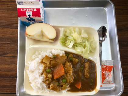 10月5日の給食の献立は、ポークカレーライス、キャベツのサラダ、りんごでした。ポークカレーライスは米粉、サラダにはノンエッグドレッシングが使われていて、アレルギーに対応した献立でした。子どもたちが大好きなカレーライスです。サラダがさっぱりしていて、カレーによく合っていました。りんごは自然な甘さと歯ごたえでした。