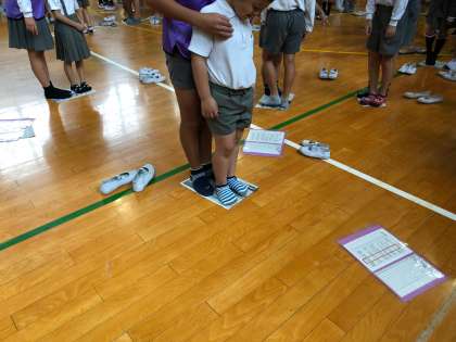 木曜日の児童集会は、集会委員会のゲームでした。【折って乗って新聞]というゲームで、高学年と低学年の二人のペアになって、新聞紙の上に乗り、だんだん半分に折って小さくなった新聞紙の上に乗るゲームです。簡単なゲームですが、二人が協力して笑いながら進めていくので、見ている方も笑顔になります。朝からすてきな交流が生まれました。