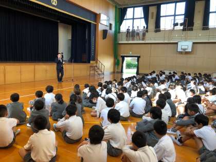 朝、東淀川警察の方に来ていただき、防犯のお話をしていただきました。一人で遊ばない、家の人に誰とどこへ行くのかを知らせる、知らない人についていかないなどの5つの約束を聞きました。子どもたちには安全に気をつけて過ごしてほしいです。
