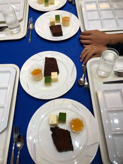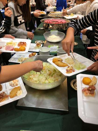 6時5分前には全員揃って、夕食です。バイキングなので、自分の好きなものが食べられるので、みんな楽しみにしていました。デザートも配られていて、お腹いっぱい食べられて、大満足でした。