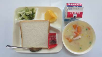 今日の給食のメニューは、コーンクリームシチュー、キャベツと三度豆のサラダ、かき、牛乳、パン、でした。コーンクリームシチューは濃厚で味わい深く、まろやかでクリーミーな仕上がりとなっていました。じゃがいもはホクホクでやわらかく体まで温まる感じになりました。鶏肉はワインで下味がつけられていて、ベーコンの塩気がピリッと効いてアクセントになっていました。キャベツと三度豆のサラダは緑が鮮やかでさっぱりとしていました。かきはほんのりと甘く、秋を感じさせてくれました。