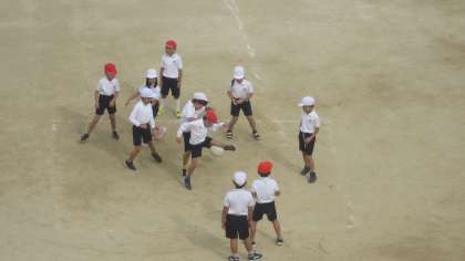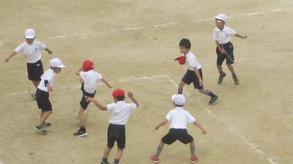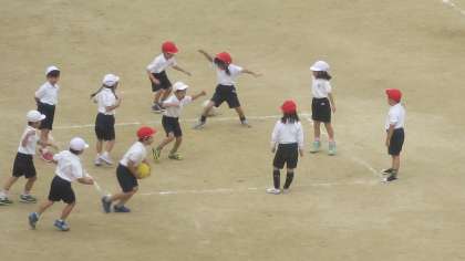 なにやら楽しそうな声が運動場から聞こえてきます。1年生が体育の授業で「ボール遊び」をしていました。友だちが投げたボールをヒョイと上手によけていきます。