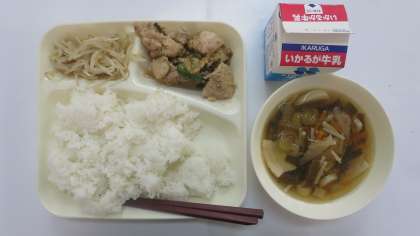 今日の給食のメニューは、鶏肉のごまだれ焼き、ソーキ汁、もやしのしょうが醤油和え、牛乳、ごはん、でした。鶏肉のごまだれ焼きはごまだれの風味が漂い、鶏肉は皮はパリッと中はやわらかく香ばしく焼かれていました。ソーキ汁はこんぶだしがしっかりと効いていて、味に深みがありました。短冊に切られたこんぶの食感が楽しめ、厚めの豚肉もボリューム感たっぷりでした。もやしのしょうが醤油和えはほんのりとしょうがの香りがして、もやしもシャキシャキ感が残るゆで具合でした。