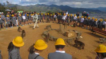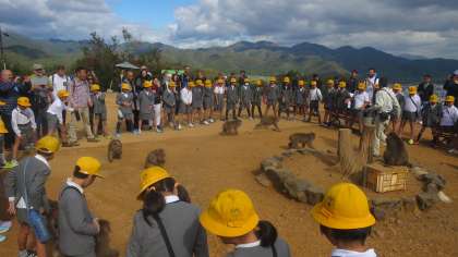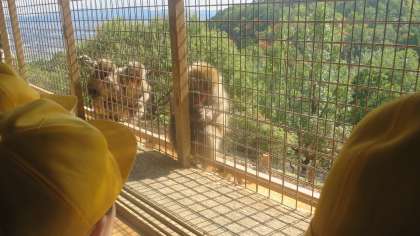 おさるさんのえさやり体験もしました。みんなで大きな円を作って足を開いて立ちます。係の人がその中でえさをまくと、子どもたちの足の間を通って来るわ来るわ、どんどんおさるさんが集まってきます。子どもたちは「キャーキャー!キャーキャー!」…まったくどっちがおさるさんかわかりません(笑)おさるさんも子どもたちも大喜びでした。