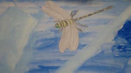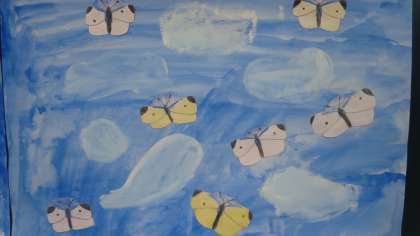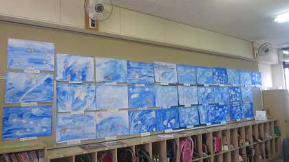 3年生の教室の後ろに「青空とこん虫」というテーマで作品が掲示してありました。真っ青の気持ちがいいほどの青空がかべいっぱいに広がっていました。その中に、子どもたちが描いたこん虫たちが生き生きと飛んでいました。近づいてよく見てみると、こん虫は別の画用紙に描かれていて、青空の絵にぺたんと貼られているんですね。教室の中がとっても明るい雰囲気になっていました。