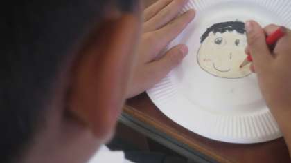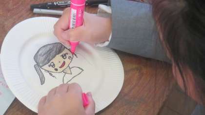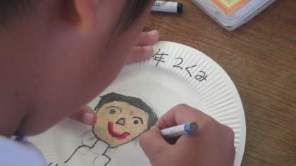 2年生の子どもたちが紙皿にじぶんのかおを描いていました。