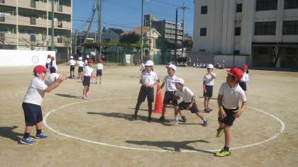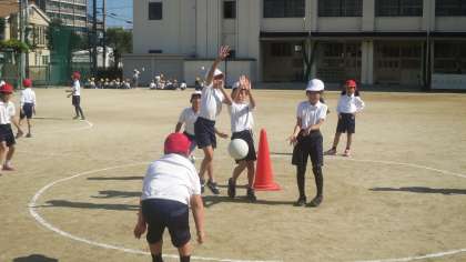 2年生の子どもたちが体育の授業で「まとあてゲーム」をしていました。真ん中に置かれた三角コーンをねらって円の外からボールを投げます。守りがうすいところをさがして、えいっ!パスをしたりすばやく動いたり…、攻め方の工夫を考えていました。。