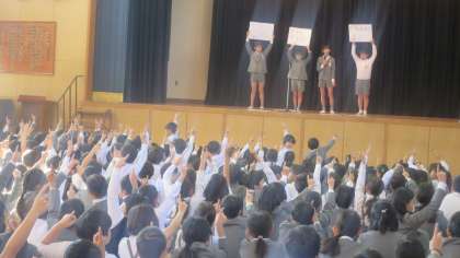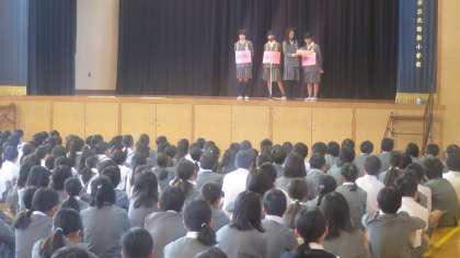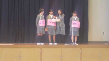 児童集会がありました。今日は給食委員会の発表でした。給食委員会の子どもたちが事前に調理員さんにいろいろとインタビューして、それについて発表したりクイズにしたりしていました。調理員さんたちの子どもたちに対する思いや願いを知ることができ感謝の気持ちをもつことができました。またクイズを通して栄養バランスなどについて学ぶことができました。子どもたちはみんな積極的に手をあげていました。