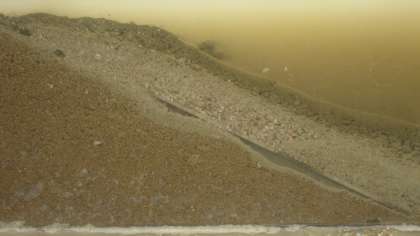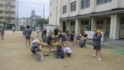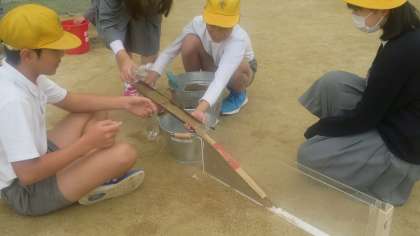 6年生が理科の授業で「地層のでき方」について実験をしていました。いったい地層はどのようにしてできるのだろうか。流れる水のはたらきが関係しています。れき(石)、砂、どろが混ざった土をといにのせて、水で少しずつ流し込んでいきます。水がにごってきたら少し待って、また土を水で少しずつ流し込みます。さあ、うまく実験は成功したのでしょうか。上手にできたみたいです。実験の結果から、流れる水のはたらきによって運搬された土は、つぶの大きさの違うれき(石)、砂、どろに分かれて順々に水底に堆積していくことがわかりました。