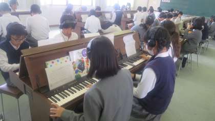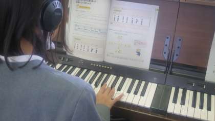 6年生が自分たちで曲をつくっていました。相談しながら楽譜を書いて、グループで音合わせをしていきます。全員がヘッドフォンをしてそのグループの人だけがきくことができて、お互いに確かめ合うことができます。「うん、いいんじゃないかな。」「ここがちょっと変な感じやから変えよう。」「もっとみんなで合わせよう。」…、いろいろと子どもたちの会話はきこえてくるのですが、なにぶん外からはどんな曲になっているのかわかりません。どんな曲ができているのでしょうね。