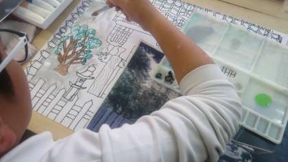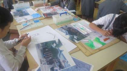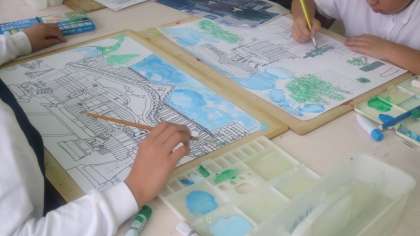 5年生が作品展に展示するための絵画作成に取り組んでいました。見本の写真を見ながら、色をぬっていました。小筆でていねいにていねいに、こまかくこまかく・・・。時間をかけて集中力を高めて・・・。きっと力作ができあがると思います。