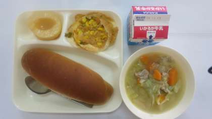 今日の給食のメニューは、豚肉と野菜のスープ煮、変わりピザ、白桃(缶)、牛乳、パン、でした。豚肉と野菜のスープ煮は野菜が食べやすい大きさにカットされていて豚肉もやわらかく、薄めのチキンスープが塩、コショウ、醤油で落ち着いた味にととのえられていました。変わりピザはピザソースがぬられたギョーザの皮がパリッと香ばしく、ツナ、ピーマン、コーンなどの具材も色とりどりできれいでした。白桃(缶)は子どもたちにとても人気があります。