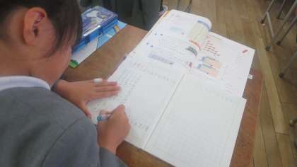 子どもたちは習った九九を活用して、一生懸命に問題に取り組んでいます。
