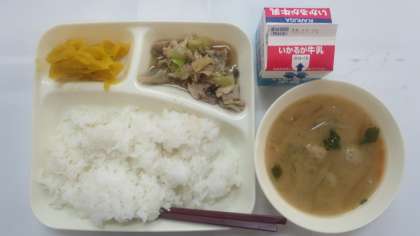 今日の給食のメニューは、豚肉とまいたけの炒めもの、つみれ汁、かぼちゃういろう、牛乳、ごはん、でした。豚肉とまいたけの炒めものはしょうゆベースの和風味付けで豚肉の旨みが引き出されていて、まいたけの食感が楽しめました。つみれ汁はだしの効いたみそ汁にいわしだんごの風味がとけ出していて味わい深く、細かく刻まれた野菜もやわらかくて食べやすかったです。かぼちゃういろうはかなりもっちりとした仕上がりで、かぼちゃの甘さが際立っていました。