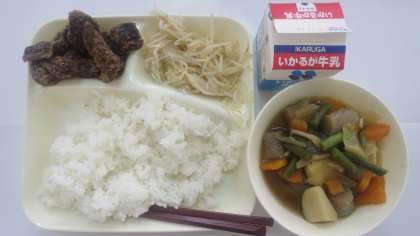 今日の給食のメニューは、くじらの竜田揚げ、里芋と野菜の煮物、もやしのゆずの香和え、牛乳、ごはん、でした。くじらの竜田揚げはしょうが汁としょうゆでしっかりと下味がつけられていて、香ばしく揚げられていました。少し固かったですが、しっかりとかむと味がしみ出してくる感じでした。里芋と野菜の煮物は里芋はやわらかく煮られ、具材が甘めの和風ベースだしにしっかりとつかっていてやさしい仕上がりになっていました。もやしのゆずの香和えはほのかにゆずの香りと酢が効いていてさっぱりとしていました。