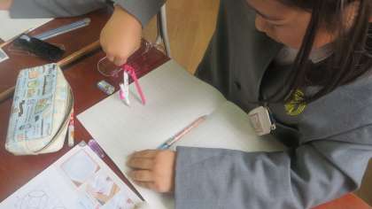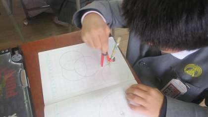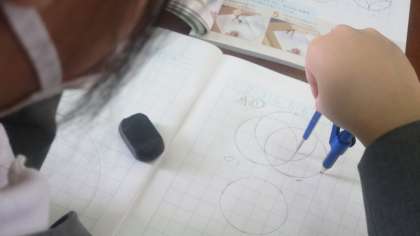 はじめはぎこちなかったコンパスの動かし方も練習すると徐々に上手になってきました。コンパスを使っていろいろなもようにもチャレンジです。「半径」「直径」「中心」という言葉も使いながら、ていねいに作業を進めていました。