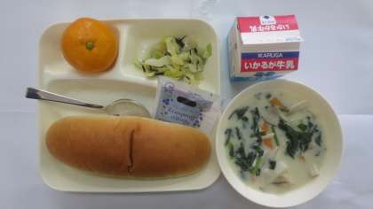 今日の給食のメニューは、きのこのクリームシチュー、キャベツのひじきドレッシング、みかん、牛乳、パン、でした。きのこのクリームシチューは手作りのクリーミーでまろやかなルウがやわらかくホクホクのじゃがいもをやさしく包み込んでいました。ほうれん草も入っていて、エリンギやしめじの食感も楽しめました。キャベツのひじきドレッシングはさっぱりとした仕上がりでおいしかったです。みかんは甘かったです。