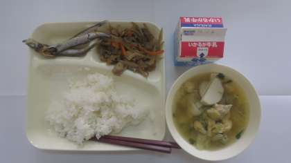 今日の給食のメニューは、焼きししゃも、五目汁、きんぴらごぼう、牛乳、ごはん、でした。焼きししゃもは焼き物機でしっかりと焼かれて焦げ目もあり、身もふっくらとしていました。五目汁はさといもがやわらかく、うすあげがしっかりとスープをすっていてより味わい深い仕上がりになっていました。具材も多かったです。きんぴらごぼうはあくをとったごぼうがやさしい甘さに味つけされていました。