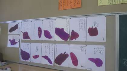 2年生の教室の後ろに先日に学習園で収穫したおいもさんの絵が掲示してありました。どのおいもさんもいろいろな形をしていて味があります。子どもらしさがにじみでていますね。おもしろいのは文章です。子どもたちがおいもさんの気持ちになりきって書かれているので思わず笑ったりほっこりしたり・・・。