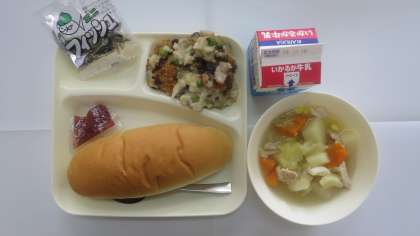 今日の給食のメニューは、鶏肉とじゃがいものスープ煮、きのこのドリア、ミニフィッシュ、牛乳、パン、でした。鶏肉とじゃがいものスープ煮はコクのあるチキンスープにやわらかく煮られた鶏肉とじゃがいも、野菜が入っていてやさしい味に仕上がっていました。きのこのドリアは手作りのまろやかなホワイトクリームソースに3種類のきのことやわらかいお米が包まれていて、焦げ色もついていて香ばしさも感じられました。ミニフィッシュは固く歯がきたえられました。