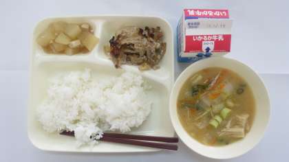 今日の給食のメニューは、豚肉の生姜焼き、みそ汁、大根の煮物、牛乳、ごはん、でした。豚肉の生姜焼きは生姜の風味と下味がしっかりと豚肉とたまねぎにつけられていて、ご飯との相性がばっちりでした。みそ汁は野菜が細かくカットされていて具だくさんでした。味付けもだしが効いたやさしい味に仕上がっていました。大根の煮物は和風仕立てで大根が透き通るほどでとてもやわらかく、冬瓜のようでした。