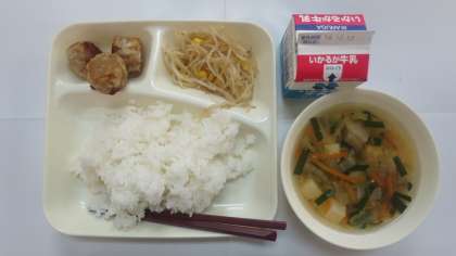 今日の給食のメニューは、揚げシューマイ、えびと豆腐のスープ、もやしとコーンのピリ辛和え、牛乳、ごはん、でした。揚げシューマイは皮はパリッと中はふんわりとやわらかく上手に揚げられていました。えびと豆腐のスープはしいたけとニラの香りが感じられる中華風スープに仕上がっていて、細かくきざまれた野菜やえびの彩りも美しかったです。もやしとコーンのピリ辛和えはもやしのシャキシャキ感を残しつつ、ラー油がアクセントになっておいしかったです。