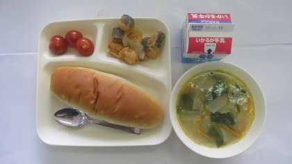 今日の給食のメニューは、さけのマリネ、肉団子と麦のスープ、プチトマト、牛乳、パン、でした。さけのマリネはさけは薄めのころもがついてちょうどよく揚げられていて、甘めの酢やオリーブ油がからまってさっぱりとした味付けとなっていました。肉団子と麦のスープは肉団子はやわらかく、麦の香りが効いた中華風スープに仕上がっていました。プチトマトは弾力がありみずみずしかったです。