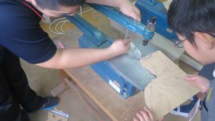 5年生の子どもたちが切り絵をしていました。来年の干支は「いのしし」です。どうやら年賀状に使うみたいです。画用紙の上にデザイン画をおいて、カッターで切り取っていきます。切り取った画用紙をそのまま年賀状に貼り付けるようです。5年生は図工が大好きで細かな作業が得意になってきています。先生の影響が大きいのかもしれませんね。ちなみに3枚目の写真は電動のこぎりです。薄い板を切ってパズルを作るみたいです。もう少し進んだら紹介したいと思います。