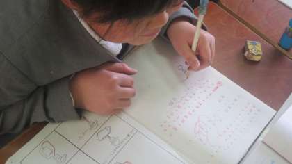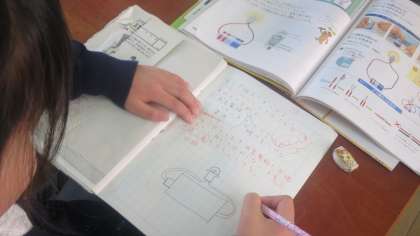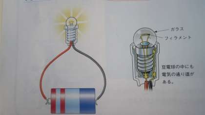明かりがつくときは、1枚目の写真のように豆電球と、かん電池の+きょくと−きょくが一つの「わ」のようにつながって、電気の通り道ができています。この電気の通り道を「回路」といいます。子どもたちはしっかりとノートにまとめていました。