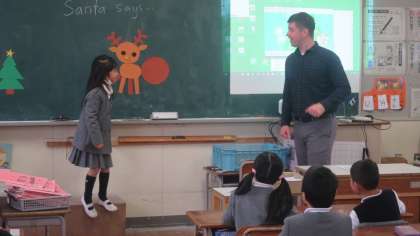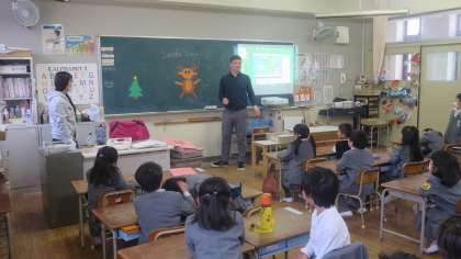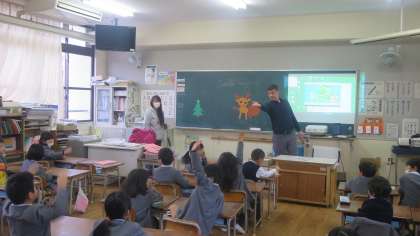 今日は1年生の教室にシェーン先生がやってきました。普段は5・6年生を中心に授業をしているので、1年生の子どもたちも突然のシェーン先生に大喜びです。クリスマスにちなんでトナカイの福笑い(?)のようなゲームで遊びます。いろんな形のトナカイができて、子どもたちも大笑い。鼻は「What color?」…、シェーン先生が聞くと、みんなで大きな声で「レッドーッ!」(*^▽^*)