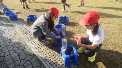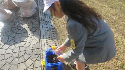 1年生の子どもたちがチューリップのきゅうこんを植えていました。植木ばちに土を入れて、先生からきゅうこんを受け取ります。「どれくらいのふかさですか。」「つちはいっぱいかけますか。」…、子どもたちは先生にたずねながら作業を進めていました。「せんせいー、なにいろのチューリップが咲くの?」…、「さあ、なにいろかなあ。たのしみにしていようね。」…、こんな会話が聞こえてきました。