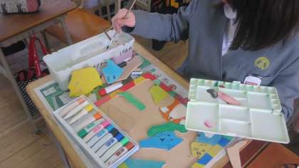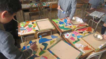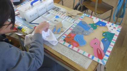 5年生が図工で木工パズルに取り組んでいます。電動のこぎりでピースを切って、色をぬっていきます。今はほとんどの子が切り終わって、色をぬっている段階でした。どの子もカラフルで楽しそうです。色をぬり終わった子は、ニスをぬってつや出しをします。表面がつるつるになって仕上がりもいい感じになりますね。