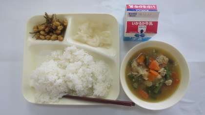 今日の給食のメニューは、鶏肉と野菜の煮物、じゃこ豆、かぶのゆず風味、牛乳、ごはん、でした。鶏肉と野菜の煮物は甘めの和風仕立てで肉じゃが風でした。じゃがいもやにんじんも食べやすい大きさにカットされていてやわらかく煮られていました。じゃこ豆はいりごまの風味が生かされ、でんぷんをまぶして揚げられた大豆は食感がもっちりしていました。かぶのゆず風味は短冊切りされたかぶがやわらかく蒸され、ゆずの香りでさっぱりとしていました。