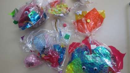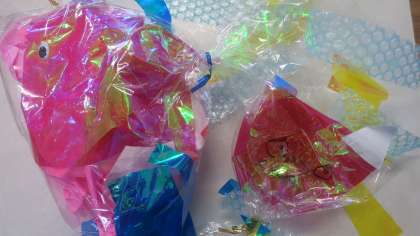 透明のふくろの中に色とりどりのセロハン紙やつつみ紙などを入れてモールやカラー針金でふくろの口を閉じます。その他にもいろいろな飾りつけをして、まるでクリスマスプレゼントのようです。これを窓にもっていって光をあてると・・・。光をとおすとキラキラしたり色の感じが変わったりするそうです。まだ作っている途中なので、できたらみんなで楽しむのかな?