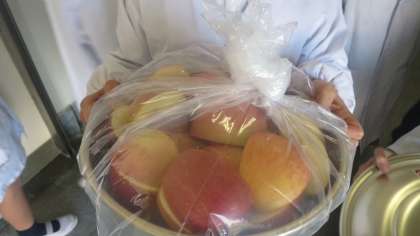 今日の給食のメニューは、たらのフライ、厚揚げと野菜の煮物、りんご、牛乳、ごはん、でした。たらのフライは、白身の身の部分がふっくらしていて、ころもはサクサクッとした感じに上手に揚げられていました。厚揚げと野菜の煮物はたけのこやごぼうもやわらかく煮られていて、しいたけのもどし汁がよい風味を出していました。厚揚げもだしをしっかりと吸っていておいしかったです。りんごは甘かったです。