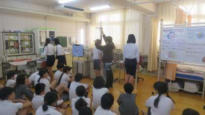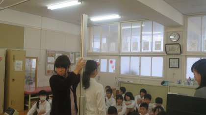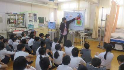 今日は6年生の子どもたちが発育測定を受けていました。どの学年も順に測定を行っていきます。身長や体重を測るのですが、その前にいつも毎回、保健の先生が授業をしてくれます。今日のテーマは「朝ごはんと睡眠、体の調子を整えよう」でした。「みなさん、トイレには毎朝行ってますか?」…、先生の質問に子どもたちはうつむきかげん。ちょっと恥ずかしいのかな。でも子どもたちはみんな真剣な表情で先生の話を聞いていました。保健の先生が夜なべして裁縫して作ったという手作りの体のしくみがとても上手でびっくりしました。それにしてもみんな本当に大きく成長してきましたね。